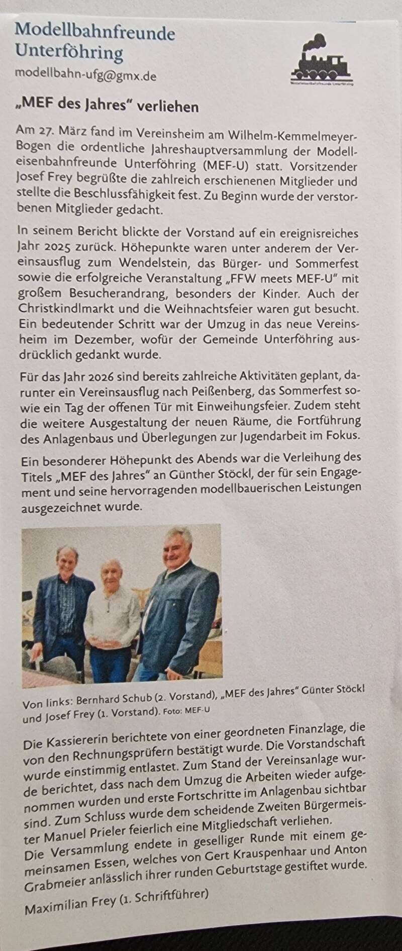 der Vorstand der Modellbahnfreunde Unterföhring lädt alle Mitglieder am 27. März um 19:00 in unser neues Vereinsheim am Wilhelm-Kemmelmeyer-Bogen 26 zu unserer diesjährigen Jahreshauptversammlung ein.